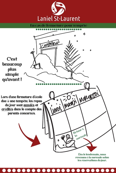 TEMPÊTE : Lors d'une fermeture d'école due à une tempête, les repas du jour sont annulés et crédités dans le compte des parents concernés. Dès le lendemain, nous revenons à la normale selon les réservations du jour.